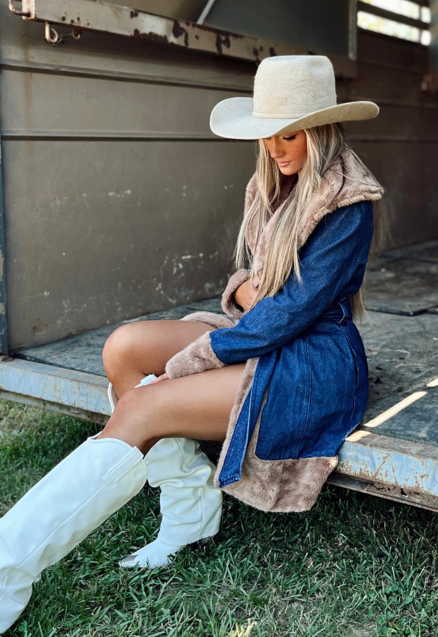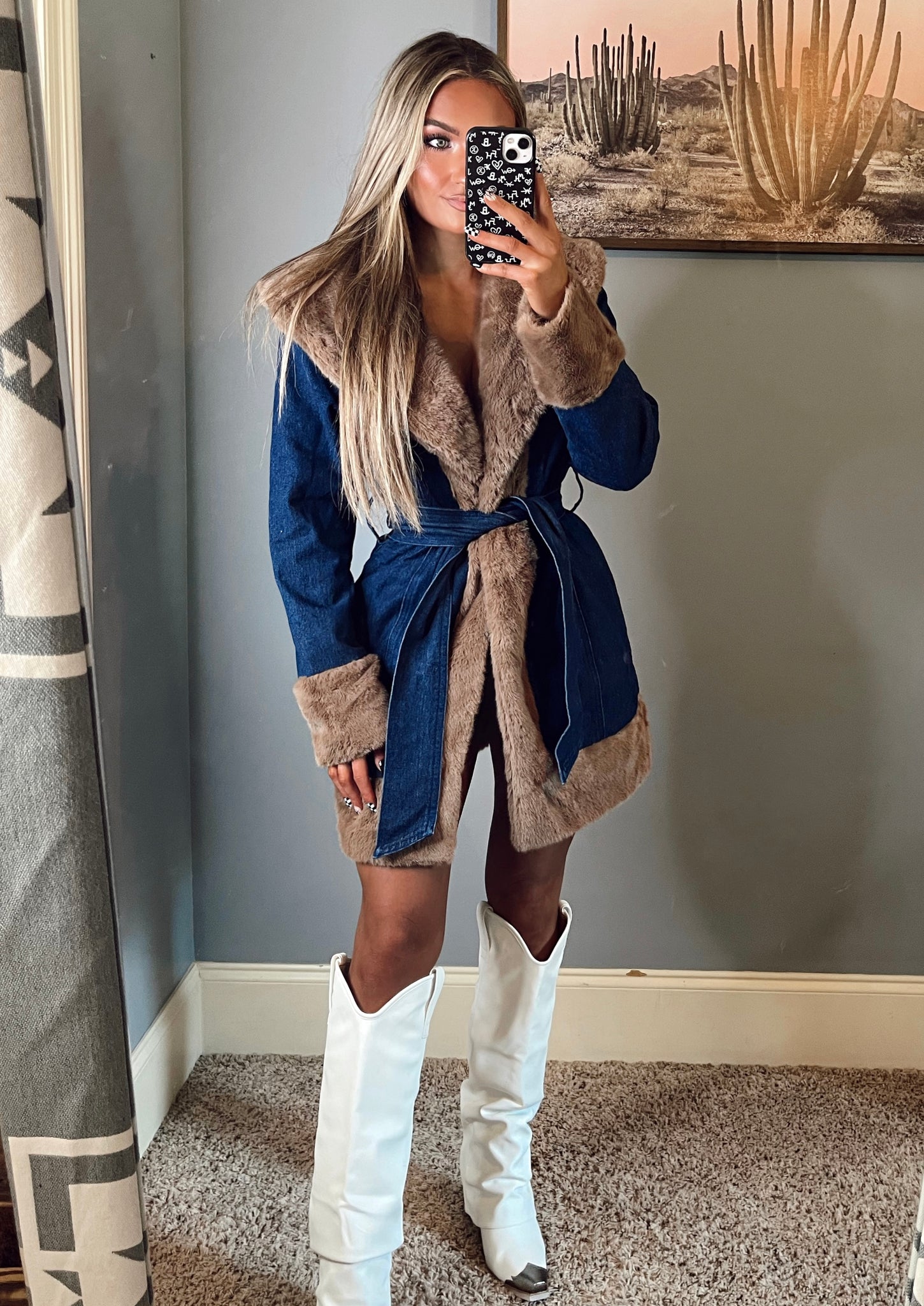 Faux fur denim lined coat with denim tie